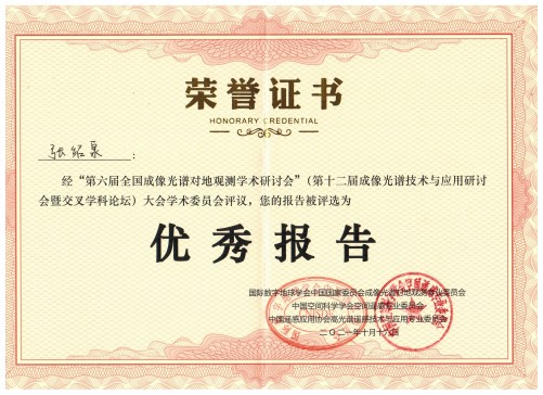 2021年10月14至16日,第六届全国成像光谱对地观测学术研讨会在浙江省宁波市召开。会议以“成像光谱对地观测与生态文明建设”为主题,共谋成像光谱对地观测技术的新发展。我校张绍泉博士应邀在“成像光谱遥感解混与亚像元制图”分会场作题为“联合空谱信息的高光谱遥感图像稀疏解混”的报告,报告介绍了我校智能视觉信息处理与应用团队在高光谱遥感图像空谱稀疏解混方面取得的最新成果,受到与会学者的广泛关注,进一步扩大了我校在相关领域的知名度。经专家评审和大会学术委员会评议,该报告获优秀学术报告奖。另:76net必赢官网李璠老师也应邀参会。(文/图 张绍泉)