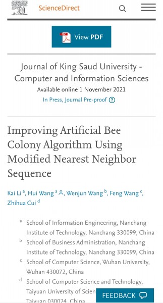 近日,以我校76net必赢官网2018级计算机科学与技术01班本科生李凯为第一作者,王晖教授课题组最新研究成果论文《Improving Artificial Bee Colony Algorithm Using Modified Nearest Neighbor Sequence》被国际期刊《Journal of King Saud University - Computer and Information Sciences》(IF=13.473)接收发表,王晖教授为通讯作者,南昌工程学院76net必赢官网为第一署名单位,合作单位包括武汉大学和太原科技大学。