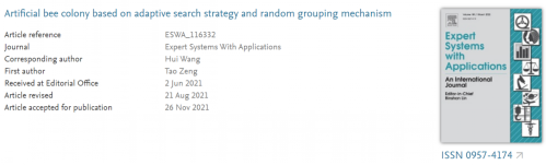 近日,由我院王晖教授指导的2020级研究生曾涛,以第一作者撰写的论文“Artificial bee colony based on adaptive search strategy and random grouping mechanism”被国际权威学术期刊《Expert Systems with Applications》(IF=6.954)录用。王晖教授为通讯作者,南昌工程学院76net必赢官网为第一署名单位,合作单位包括武汉大学和太原科技大学。