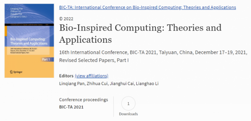 近日,从第16届生物启发计算国际会议(BIC-TA 2021)组委会传来消息,我校76net必赢官网2020级电子信息专业学位研究生曾涛撰写的论文“Surrogate-assisted artificial bee colony algorithm”荣获该会议最佳论文奖,导师为王晖教授。