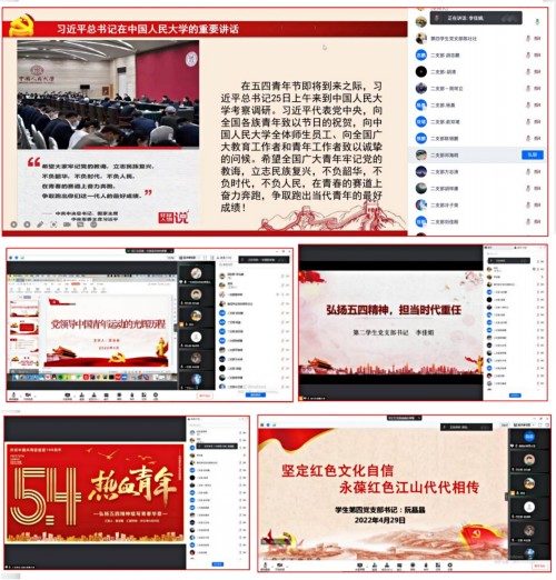 首先,四个支部主讲人带领大家共同学习,第一学生党支部学生党员匡菲菲的主题是《党领导中国青年运动的光辉历程》,第二学生党支部书记李佳娟的主题是《弘扬五四精神 担当时代重任》,第三学生党支部学生党员邬卫国的主题是《弘扬五四精神 续写青春华章》,第四学生党支部书记阮晶晶的主题是《坚定红色文化自信 永葆红色江山代代相传》。