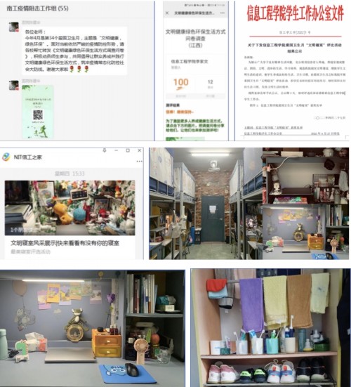 活动期间,学院通过线上加强宣传,组织师生参加问卷调查,开展为期近一个月的“文明寝室”创建评比活动,由学院团委组织专门评比小组线下实时打分,主要从寝室卫生、寝室文化、寝室纪律、寝室文明四方面进行评比,评选出文明寝室27个,并在NIT信工之家微信公众号上进行“文明寝室风采展示”。