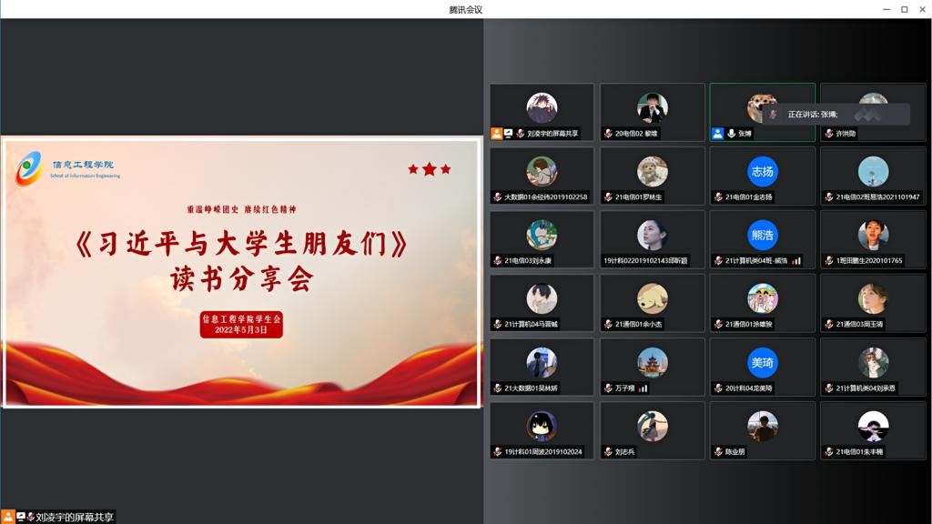 此次活动围绕《习近平与大学生朋友们》一书进行了分享与交流。分享会上,学生会代表们声情并茂地原文诵读了该书的部分章节,做到原原本本阅读。随后线上同学纷纷结合个人经历,从理想信念、社会实践等方面对《习近平与大学生朋友们》进行了学习体悟分享,切切实实领悟书本精髓。