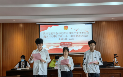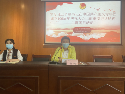 活动中,学院党委副书记马俊要求大家深刻学习领悟习近平总书记重要讲话精神,并提出三点希望:一是坚定不移听党话、跟党走,勇做走在时代前列的奋进者、开拓者、奉献者;二是不负韶华,不负时代,不负人民,做德智体美劳全面发展的新时代青年;三是要用行动践行讲话精神,用内心感应时代脉搏,书写绚烂多彩的青春答卷。与会师生对习近平总书记的重要讲话精神进行了深入的学习,并结合实际进行了热烈的讨论。青年团员代表们通过诗朗诵《迎团百年礼,青春正当时》,表达了建团百年的祝福之情,坚定了永跟党走,做优秀共青团员的决心。