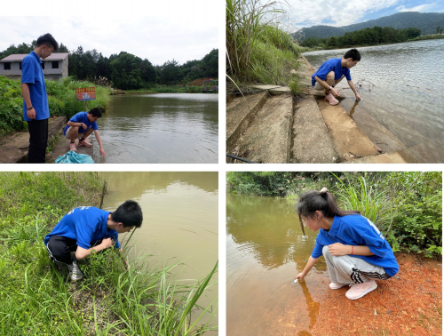 通过前期资料搜集、走访当地村民等方式,实践团已积累了当地山塘水的基本资料。在长埠村村干部的带领下,实践团前往了长埠村各个山塘进行实地调研考察,实地采集了山塘的容积、用途、水源等基本信息,并在实地勘察中,对水体质量、坝体、溢洪道等基础设施建设情况进行了统计。此外,实践团成员们在保障自身安全的前提下,对山塘水进行了采样,随后将水样送往相关水质检测机构进行专业的水质检验。