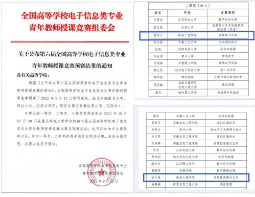 近日,第六届全国高等学校电子信息类专业青年教师授课竞赛传来喜讯,76net必赢官网青年教师钱立峰、曾翠平获得华东赛区二等奖,两位老师将于10月28日-30日代表我校参加全国总决赛。