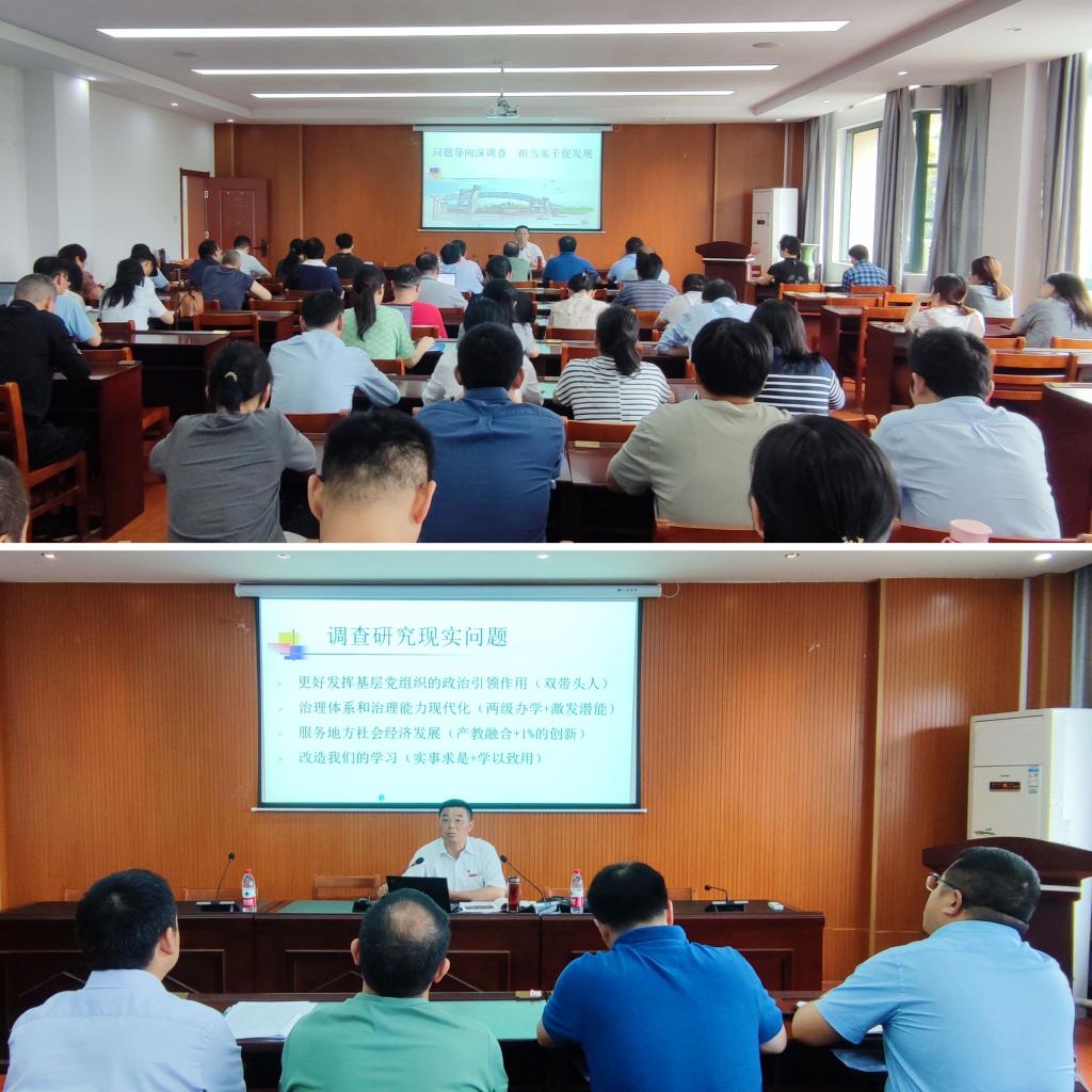 陆伟锋从“树立正确政绩观、事业观,调研研究是做好各项工作的基本功,调查研究的工作要点,调查研究现实问题”等四个方面展开阐述,结合学习贯彻习近平新时代中国特色社会主义思想主题教育、巡视巡察、新一轮本科教育教学审核评估等工作,要求广大党员领导干部要深入学习贯彻习近平总书记关于树牢正确政绩观的重要指示精神,完整、准确、全面贯彻新发展理念,努力做到为民造福、真抓实干、不务虚名、廉洁自律、久久为公。陆伟锋指出:开展调查研究是这次主题教育的重要内容,是做好工作的基础,正确的决策离不开调查研究,正确贯彻落实决策也离不开调查研究;党员干部要扑下身子,下沉一线,运用党的创新理论研究新情况,解决新问题,广大教师要深入学生,了解并解答学生的问题和困惑,每位教师尽职敬业,就是为民造福。最后,对学院提出四点要求:要更好地发挥基层党组织的政治引领作用、不断推进治理体系和治理能力现代化、提升服务地方社会经济发展能力、不断改造我们的学习。(文/图 陈谣)